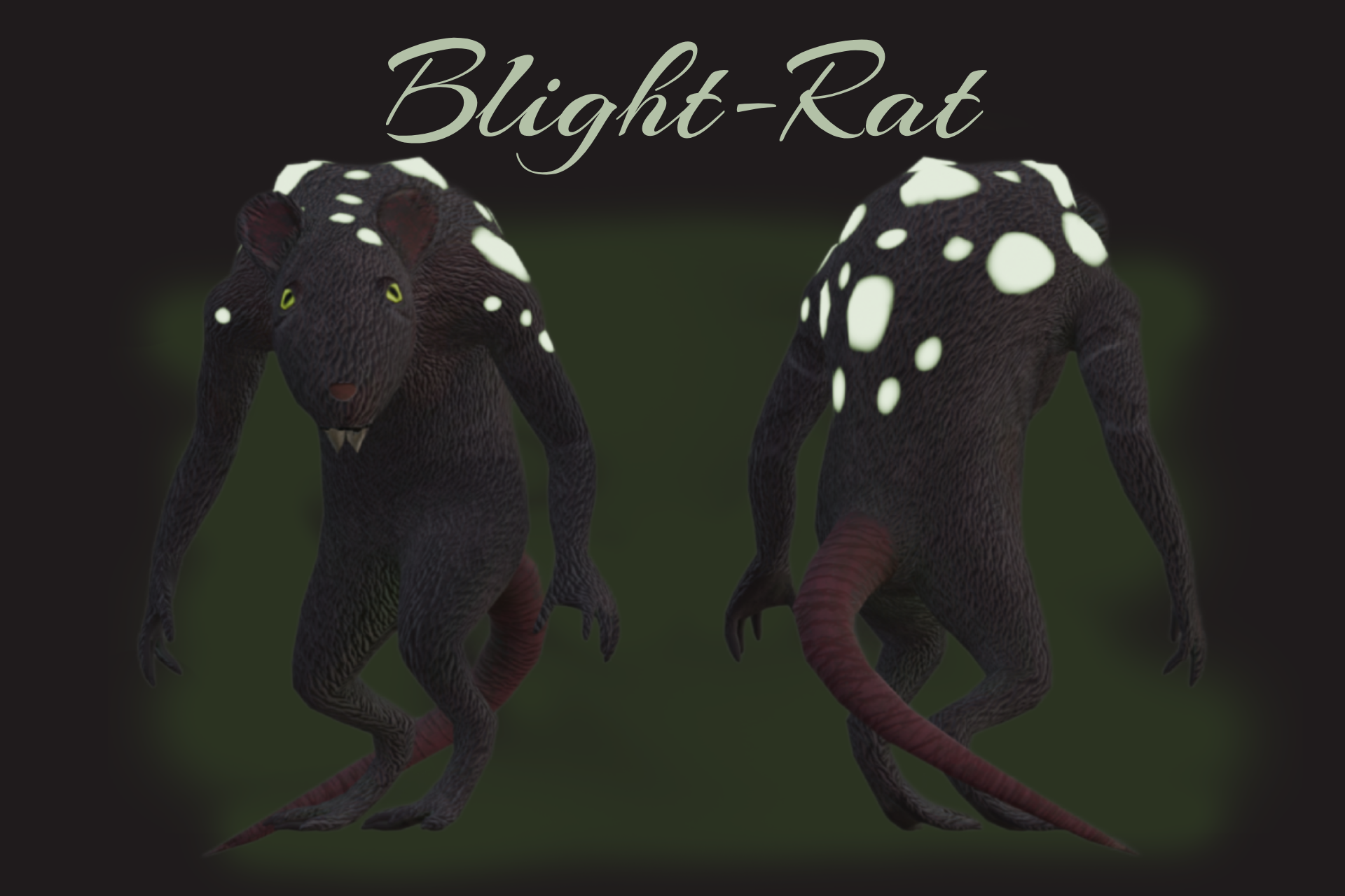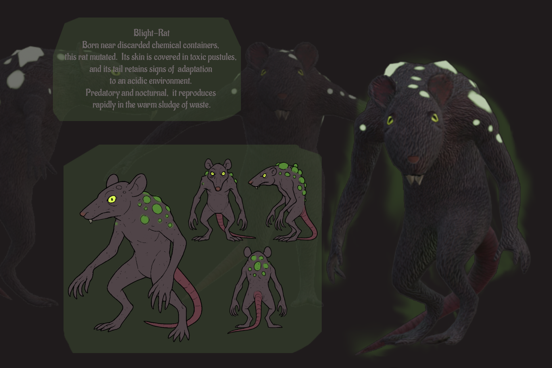 Postać 3D zaprojektowana jako asset do projektu „Nieprzyjazne środowisko”. Blight-Rat to zmutowany szczur przystosowany do życia w skażonym, wrogim ekosystemie. Jego forma wizualna odzwierciedla wpływ toksycznego otoczenia – zdeformowane proporcje, ślady choroby i zużycia podkreślają brutalne warunki przetrwania.